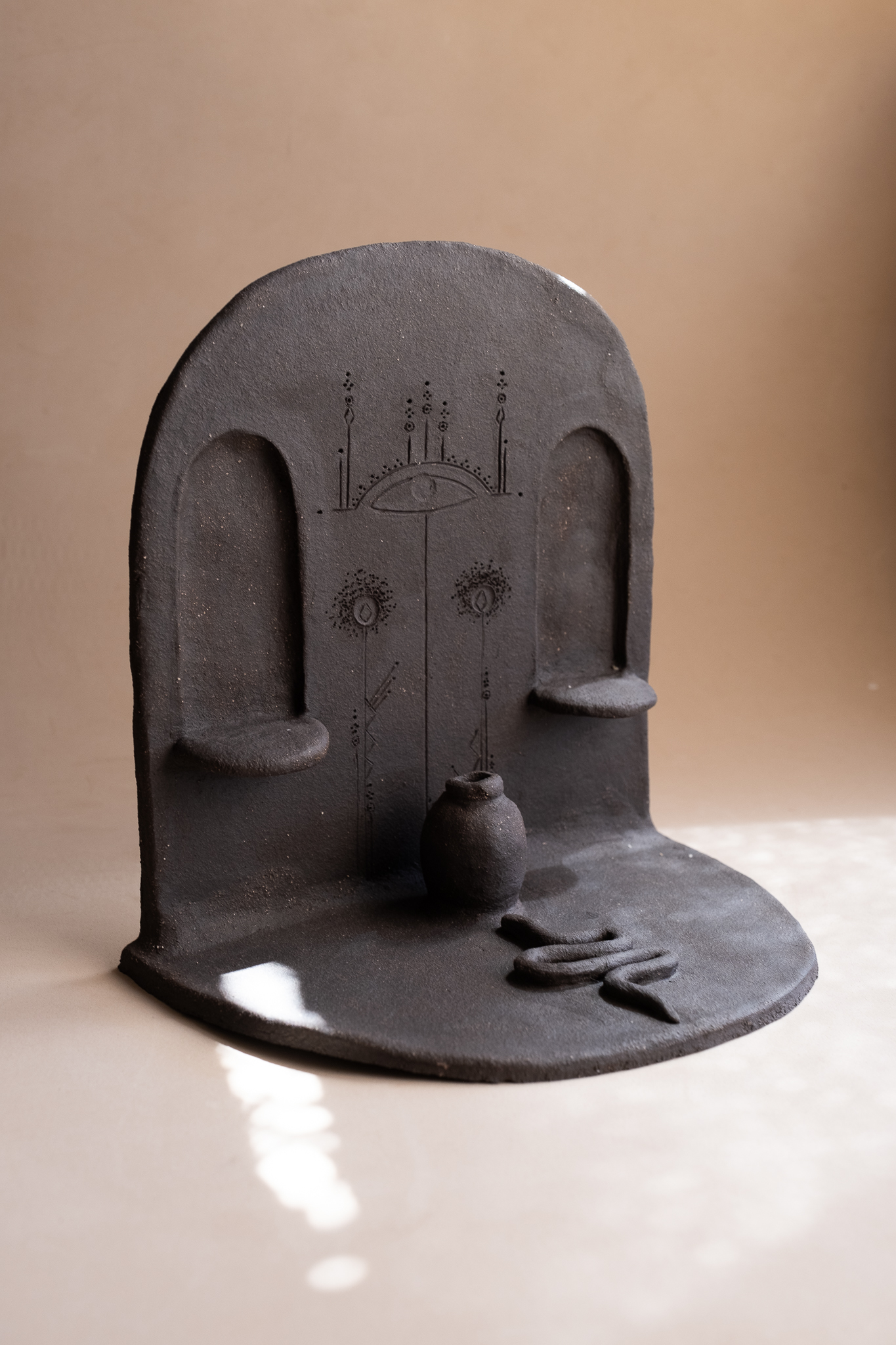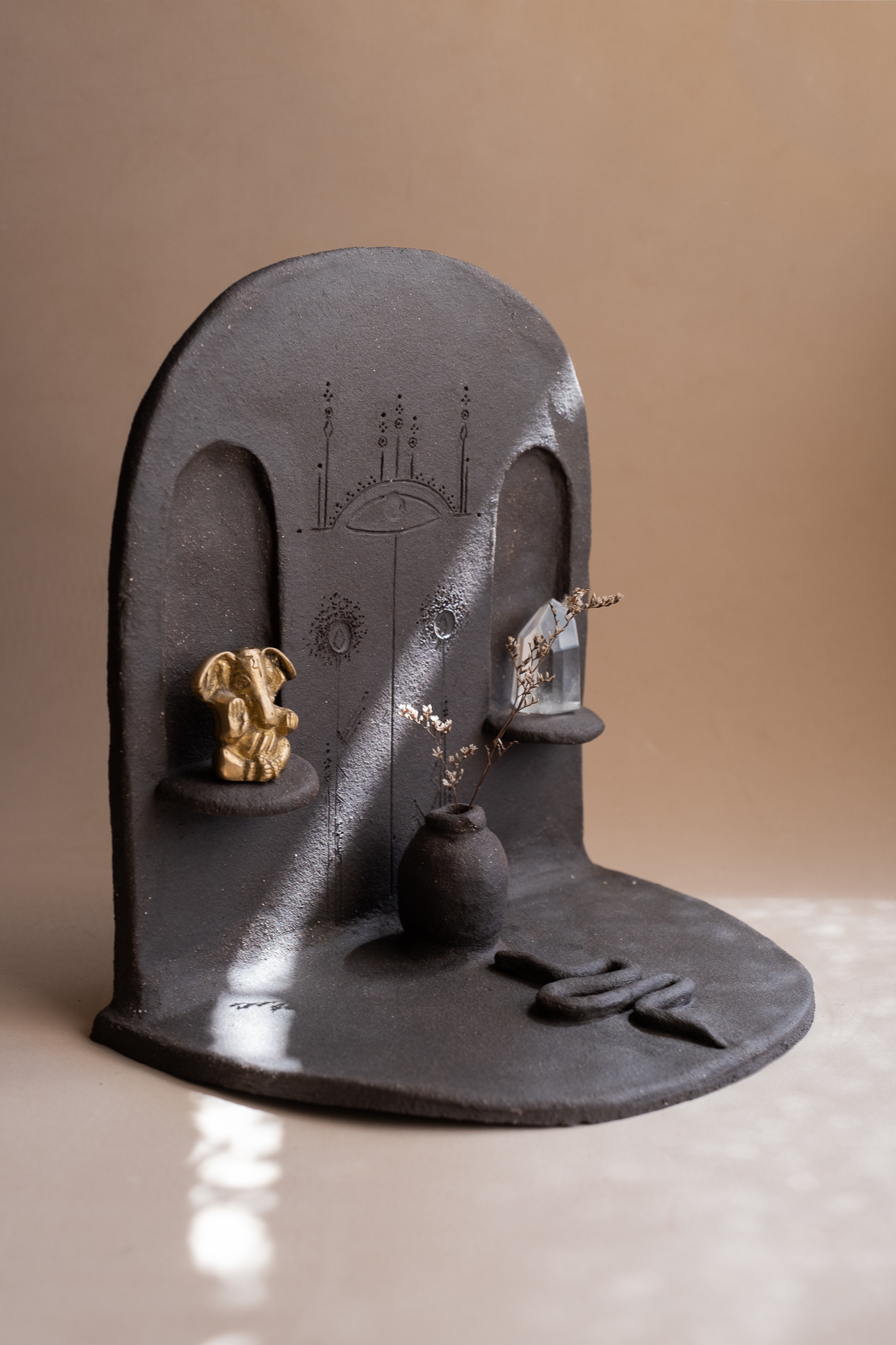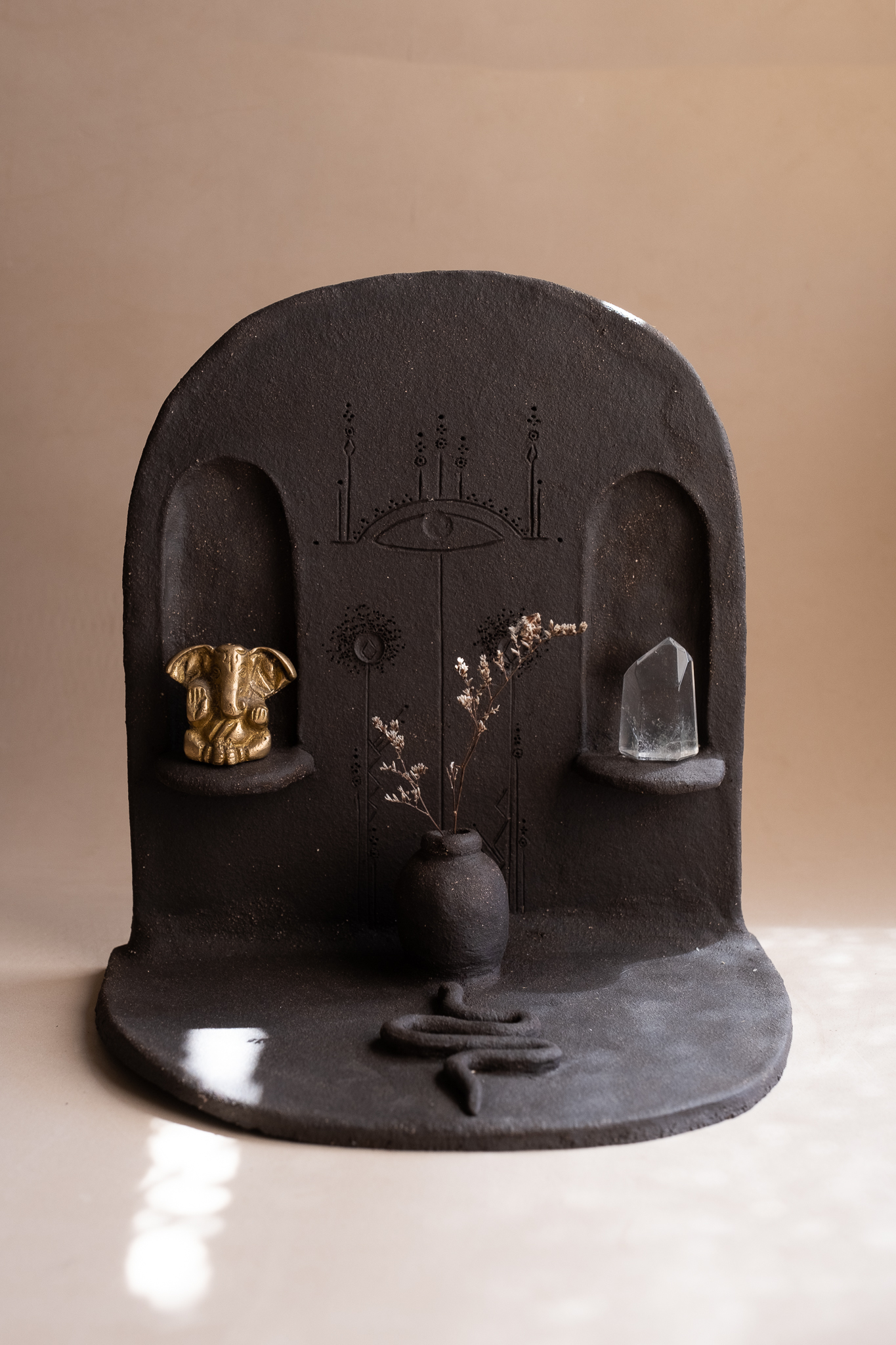 A cor escura do barro acentua o mistério e a presença do altar, convidando à introspeção e à conexão com o invisível. Cada detalhe foi moldado com intenção, resultando numa peça única que une terra, forma e símbolo num mesmo gesto criativo.