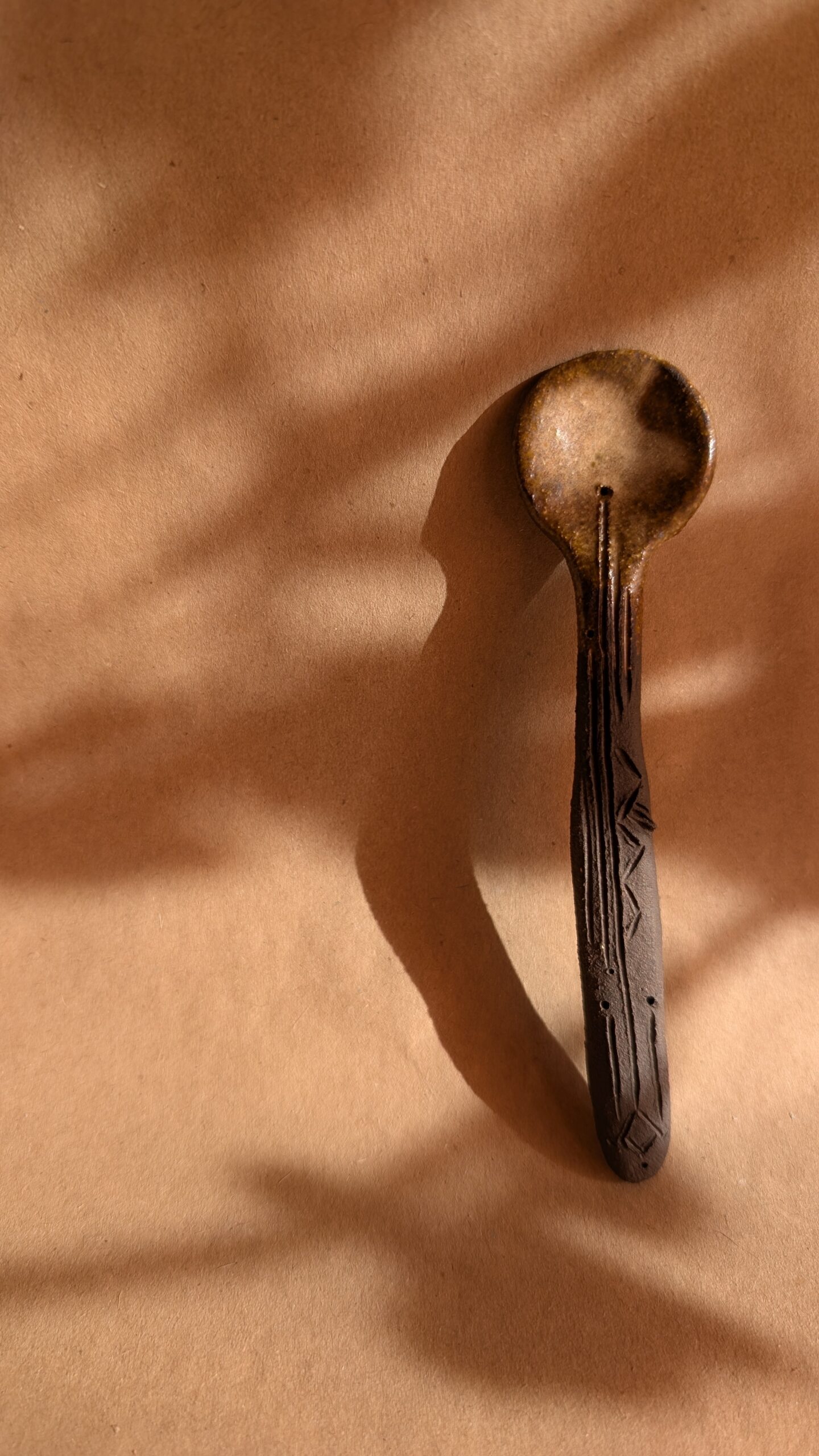 Colher de cerâmica feita à mão, moldada de forma intuitiva em cada detalhe. Cada colher é uma peça é única, que revelam o gesto manual e o tempo do processo. Pensada tanto para o uso quotidiano como para ser apreciada como objeto.