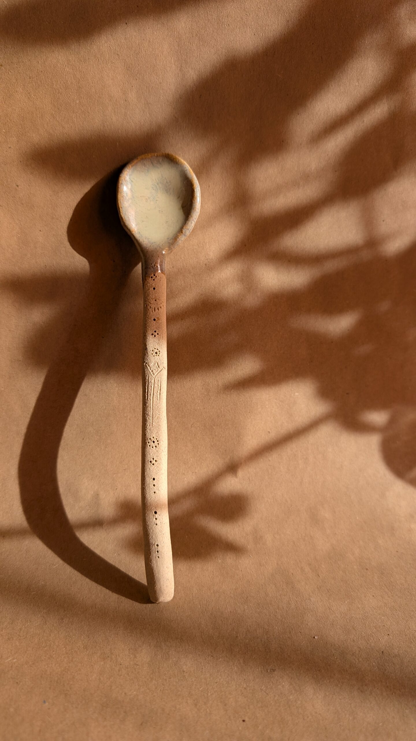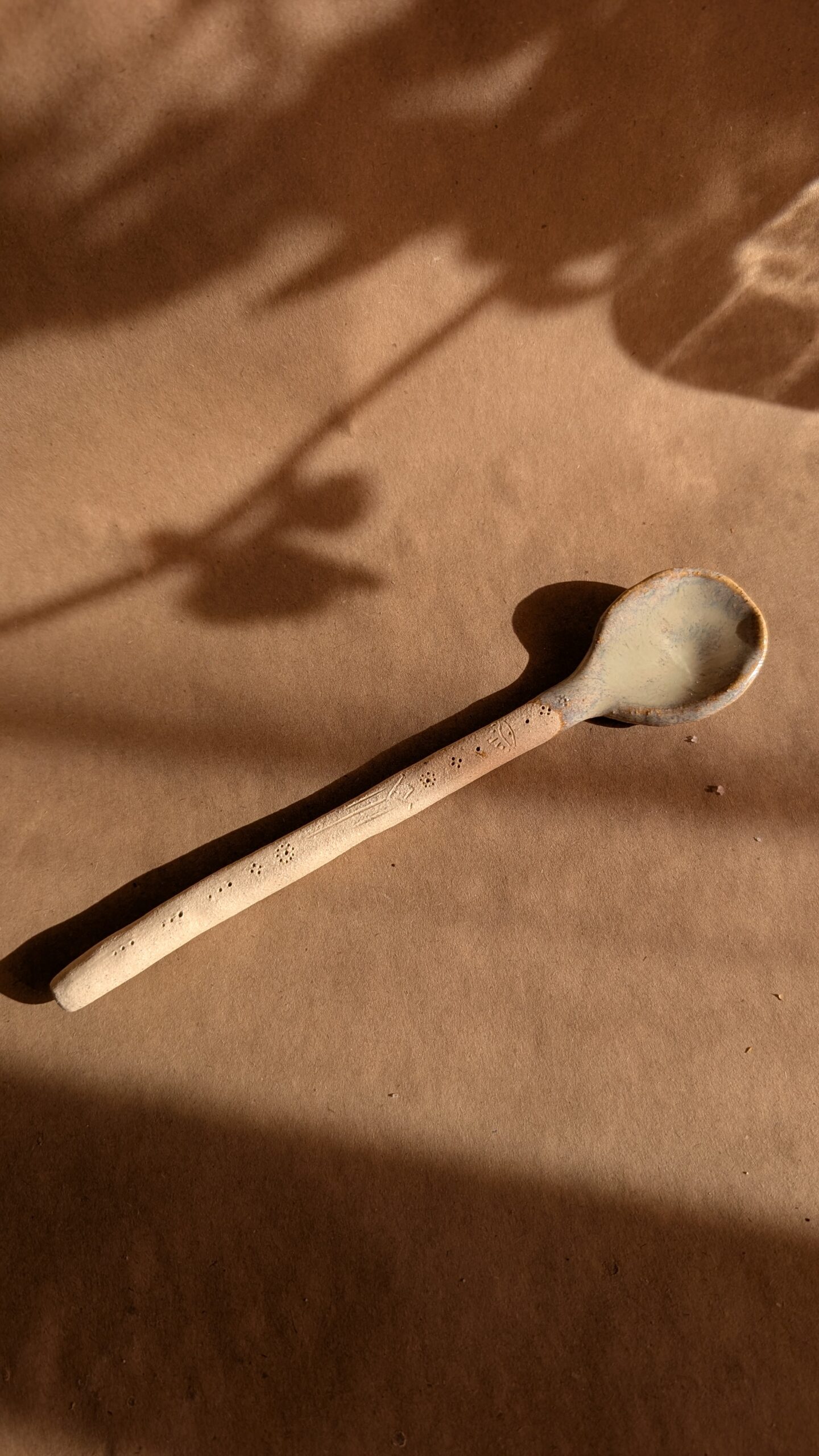 Colher de cerâmica feita à mão, moldada de forma intuitiva em cada detalhe. Cada colher é uma peça é única, que revelam o gesto manual e o tempo do processo. Pensada tanto para o uso quotidiano como para ser apreciada como objeto.