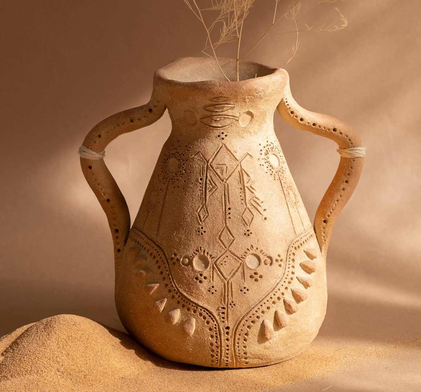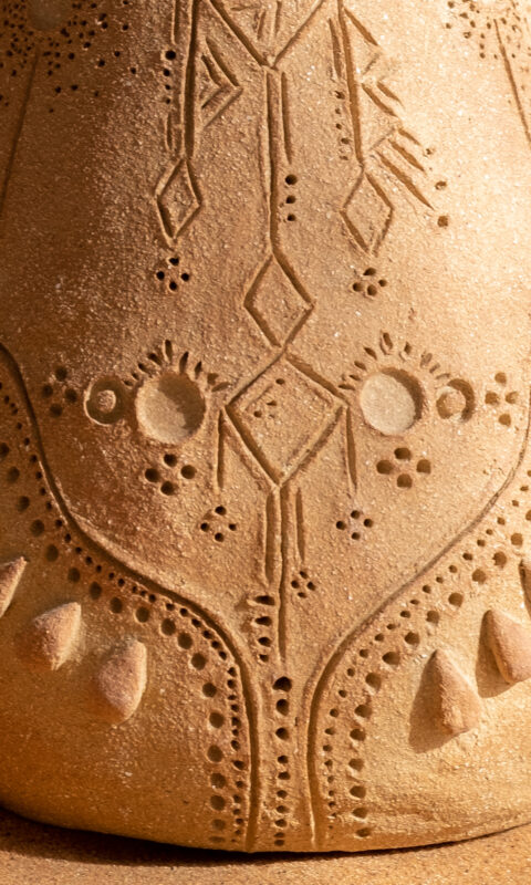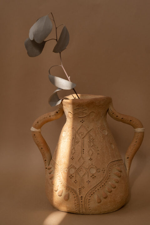 Se viajo no tempo as primeiras memórias que tenho de barro e cerâmica remontam-me à Tunísia. Parte da minha infância e adolescência foi passada nesse país do norte de África. Lembro-me de pensar que as cerâmicas que via eram da cor da paisagem daquele país. A terra, a paisagem, os mercados, o deserto, as vilas construídas em argila são elementos que me inspiram profundamente na criação das minhas peças de cerâmica. Como tal, para honrar essa inspiração e esse primeiro contato, a esta peça dei o nome de um lugar na Tunísia: Ksar Hadada.
