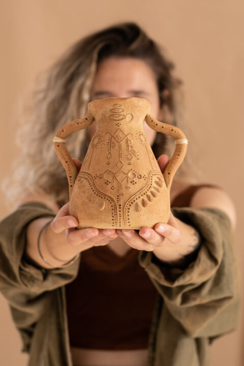 Criar cerâmica é criar com os elementos da natureza. É um encontro perfeito para a catarse. Das minhas mãos fiz nascer esta peça apenas com argila e água. Depois dei ao elemento ar a missão de a secar e por fim o fogo, mestre da transformação, tornou esta peça sólida e resistente.