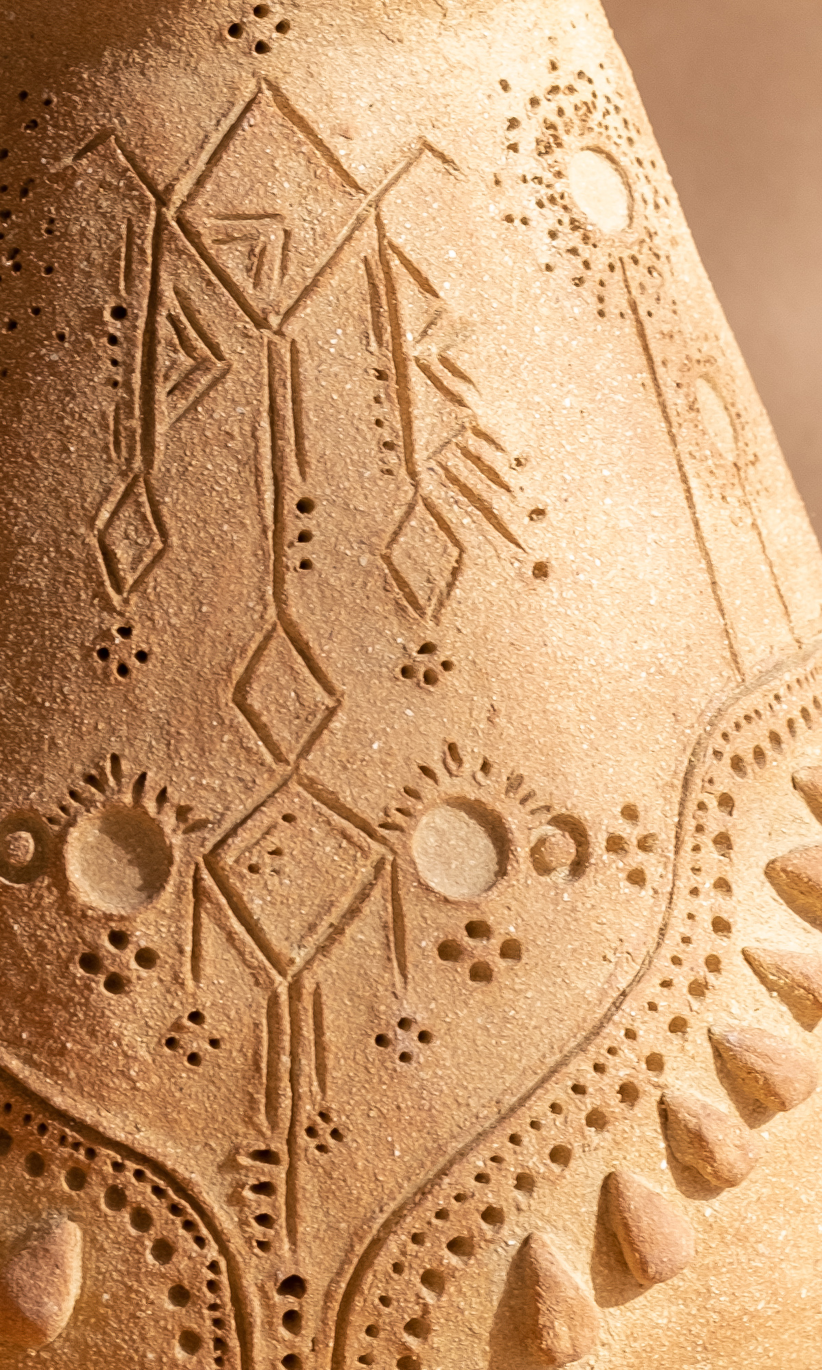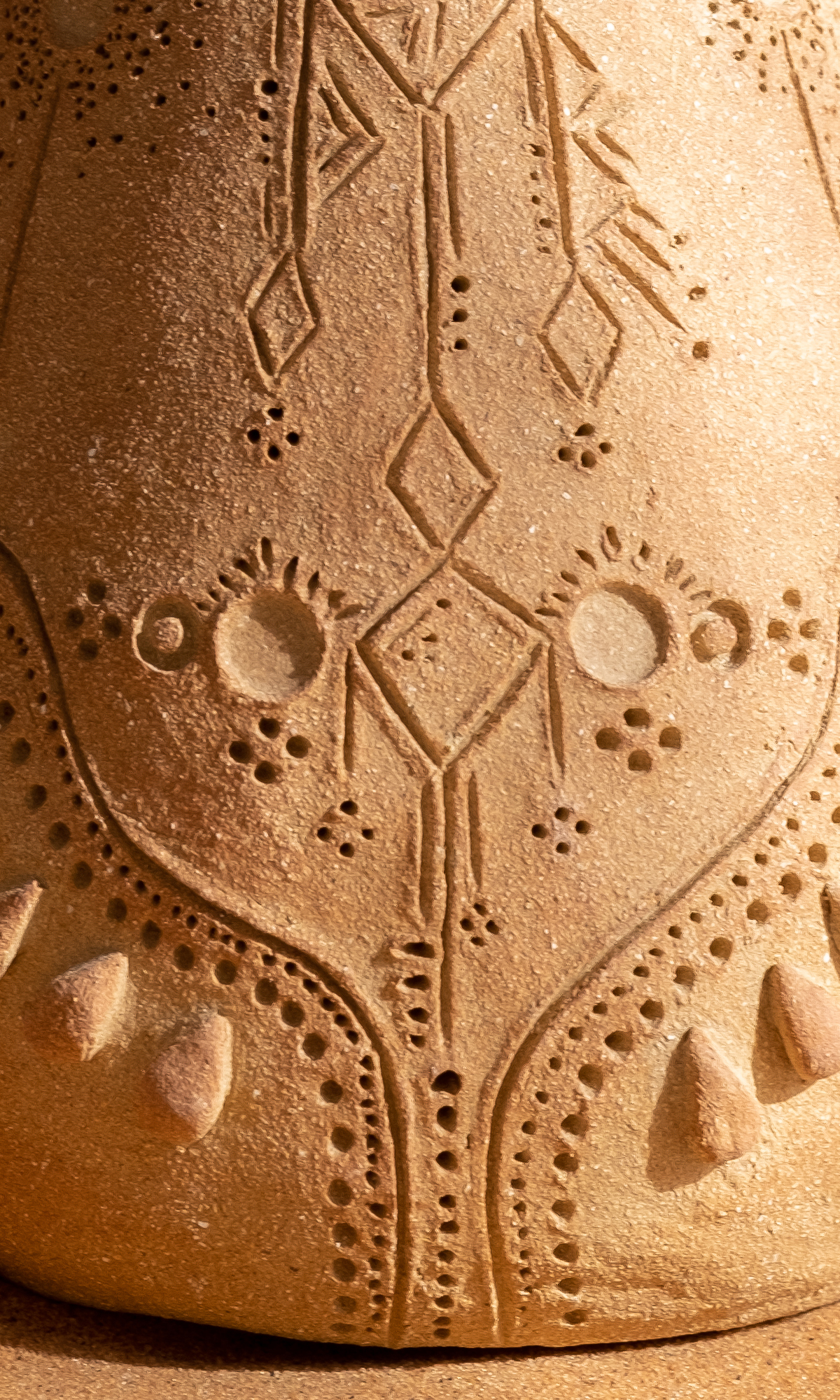Se viajo no tempo as primeiras memórias que tenho de barro e cerâmica remontam-me à Tunísia. Parte da minha infância e adolescência foi passada nesse país do norte de África. Lembro-me de pensar que as cerâmicas que via eram da cor da paisagem daquele país. A terra, a paisagem, os mercados, o deserto, as vilas construídas em argila são elementos que me inspiram profundamente na criação das minhas peças de cerâmica. Como tal, para honrar essa inspiração e esse primeiro contato, a esta peça dei o nome de um lugar na Tunísia: Ksar Hadada.
