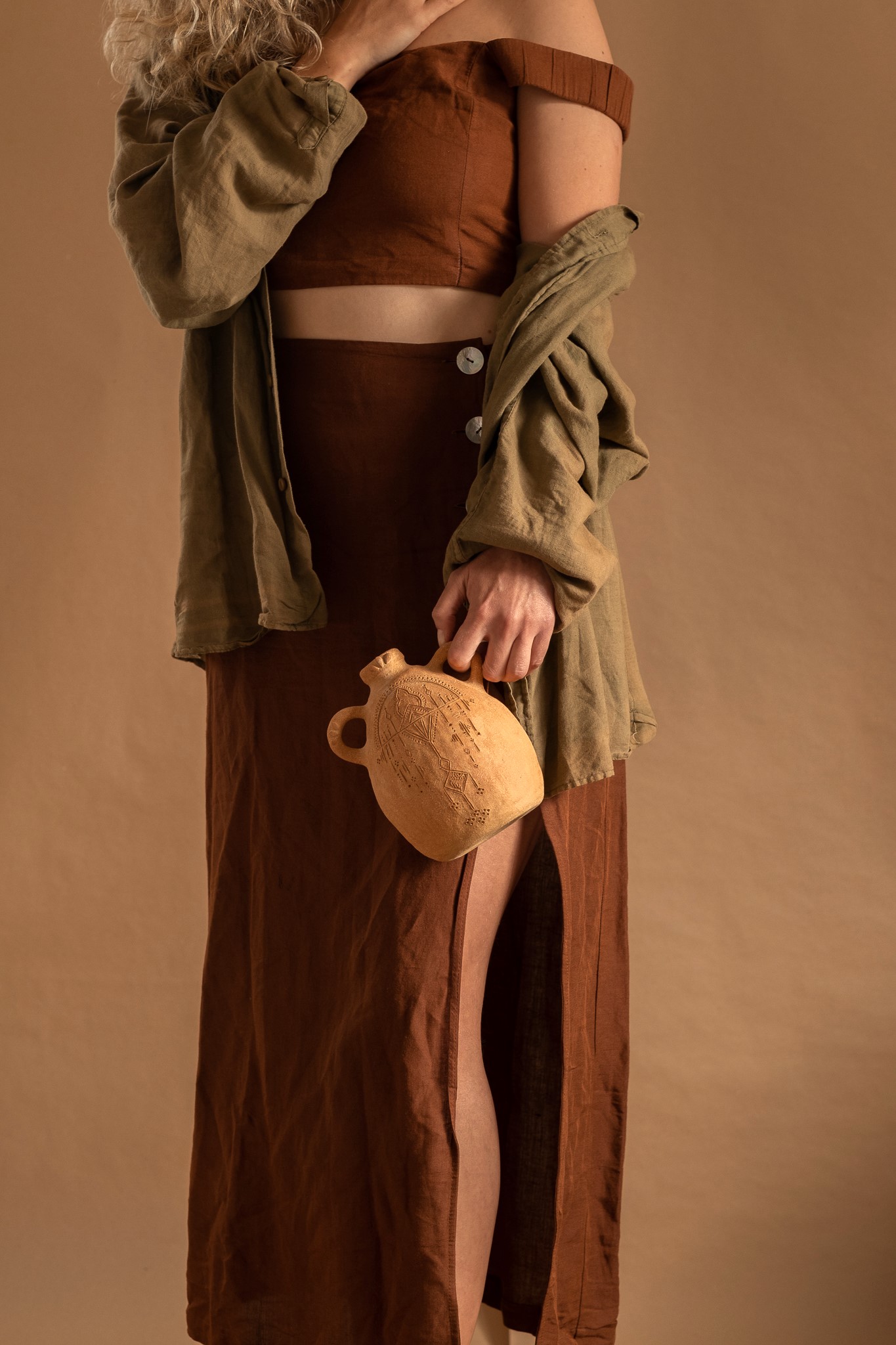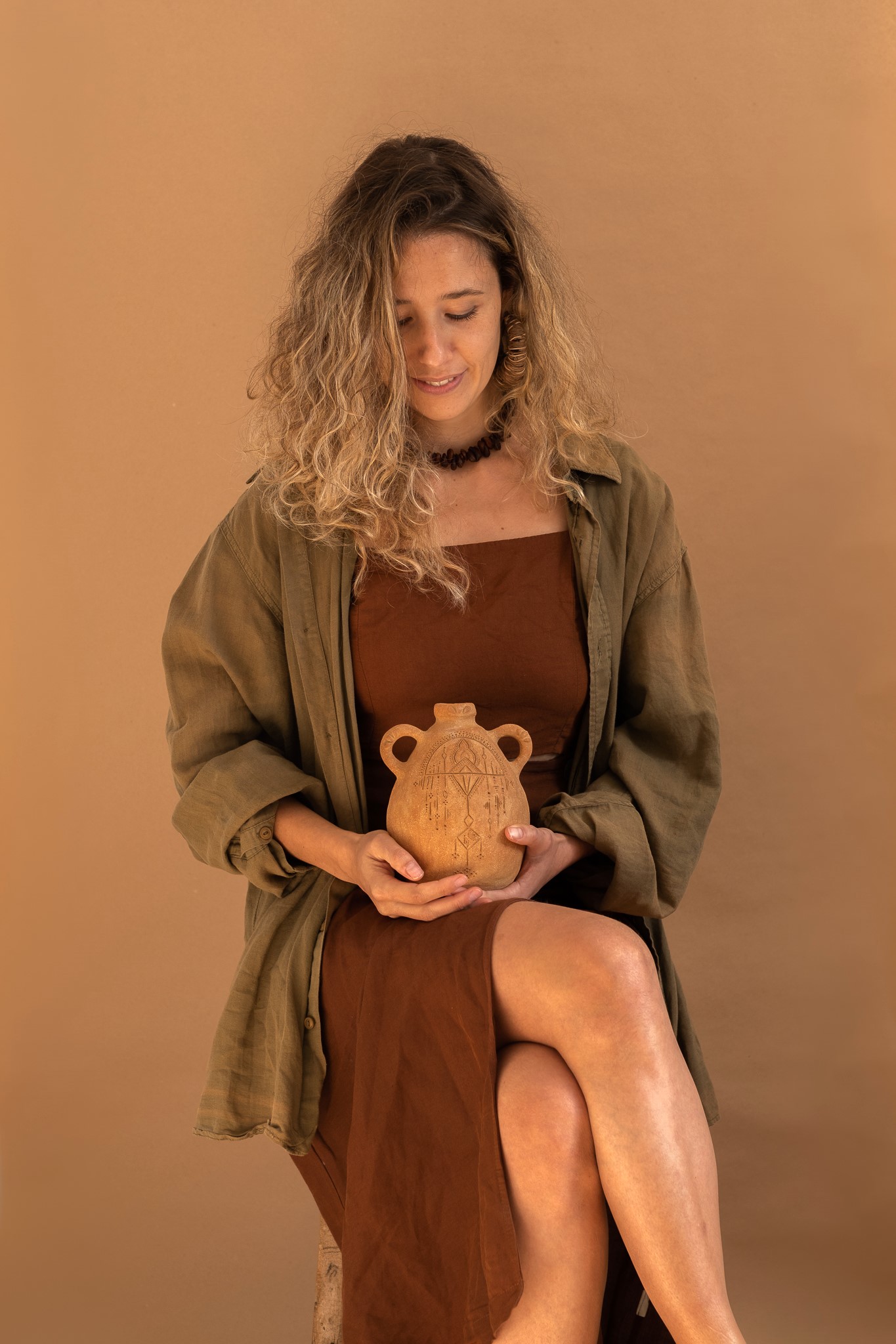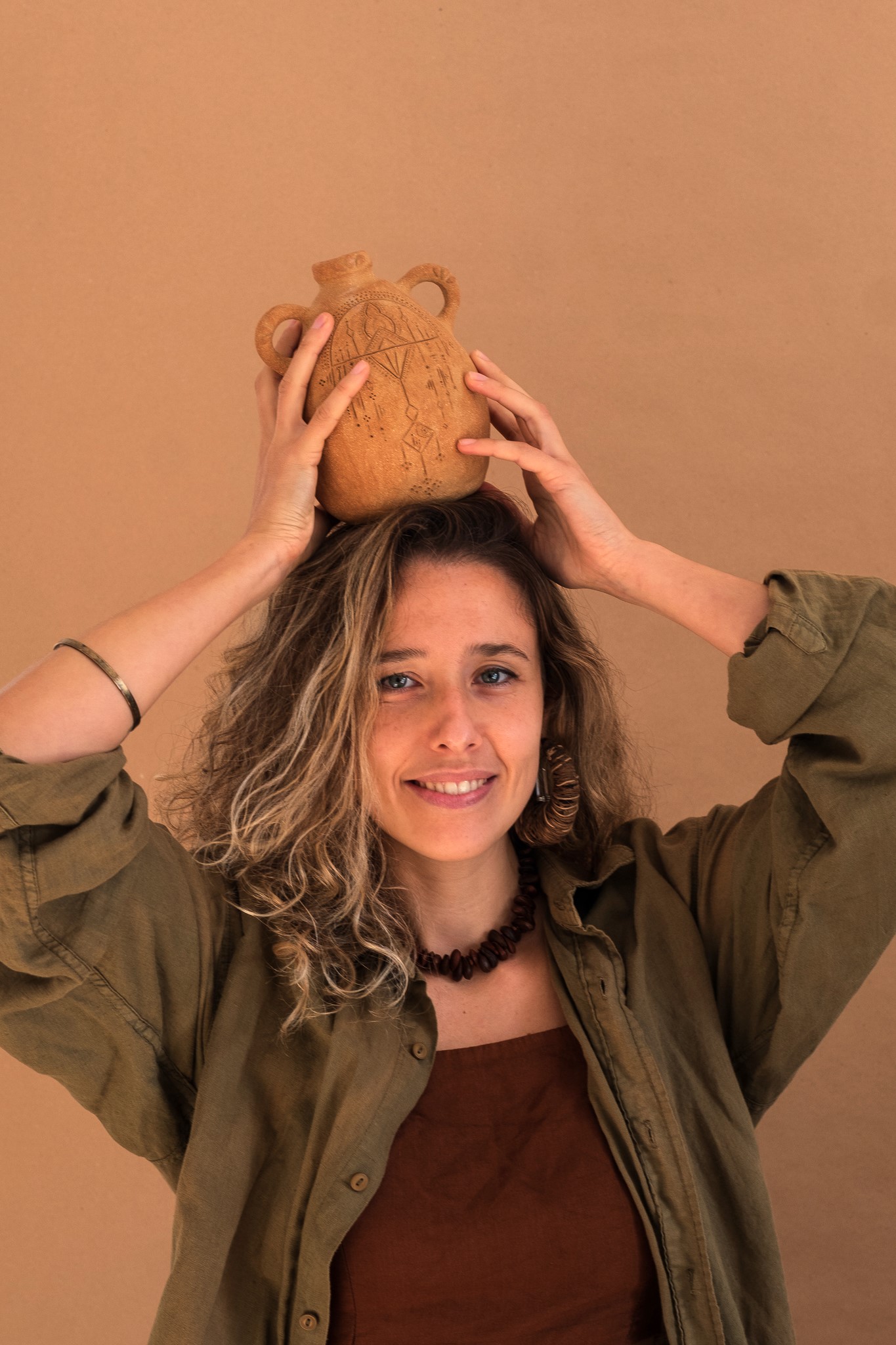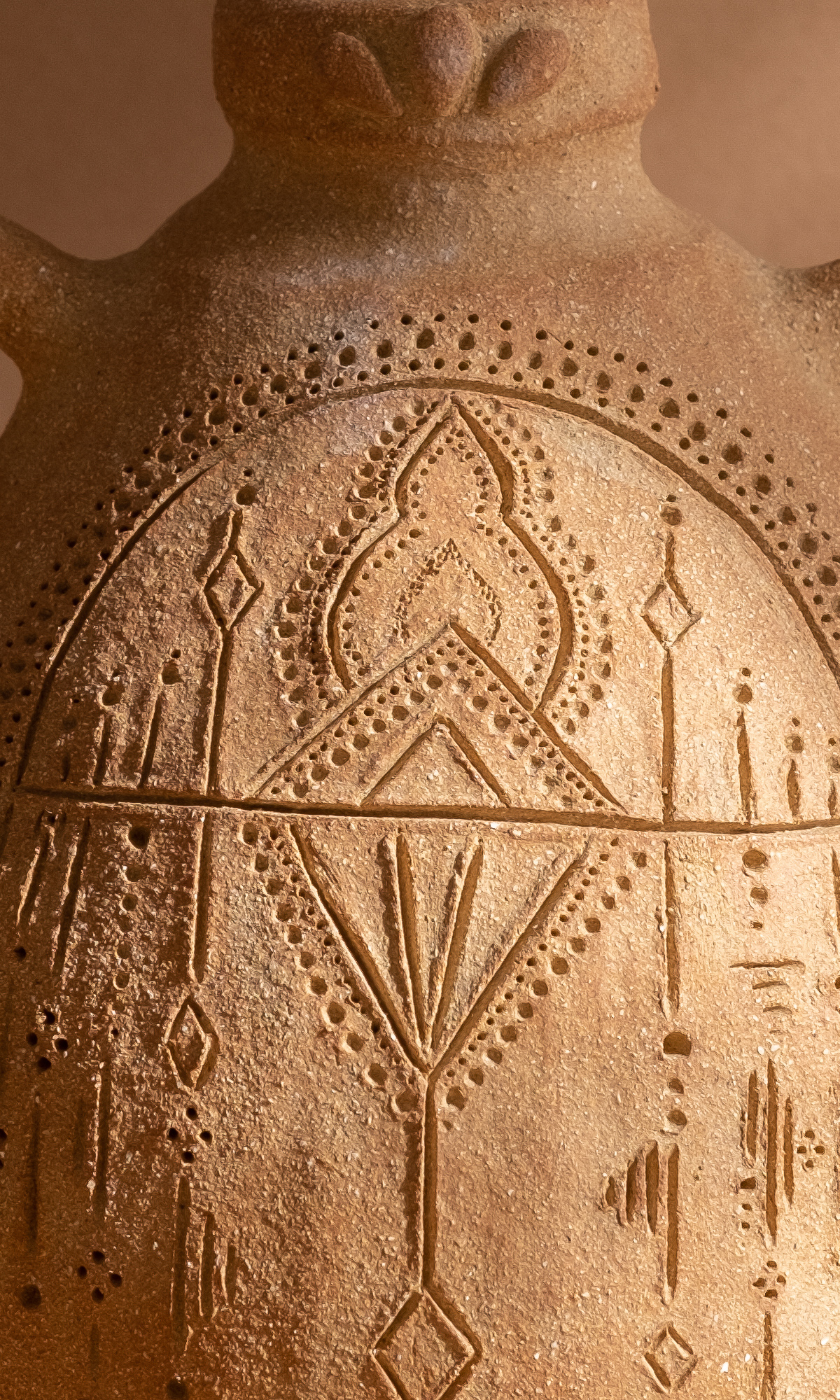 Peça única e enriquecida com detalhes desenhados. Esses desenhos são um portal que me transportam para o espaço onírico onde visito vilas erguidas com paredes de argila. De certa forma é como se eu revisitasse um lugar, onde noutra vida, já foi meu.