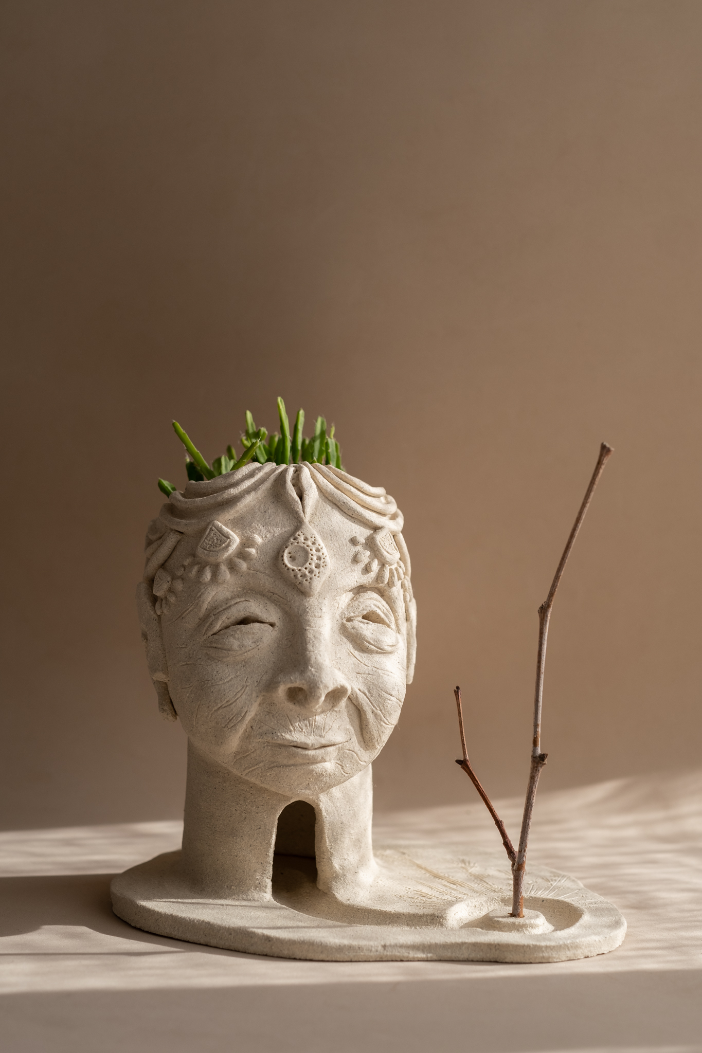 Dentro da cabeça pode ser ainda colocada uma planta. No seu interior tem um orifício por onde passa a água que escorre pela garganta que chega ao galho.